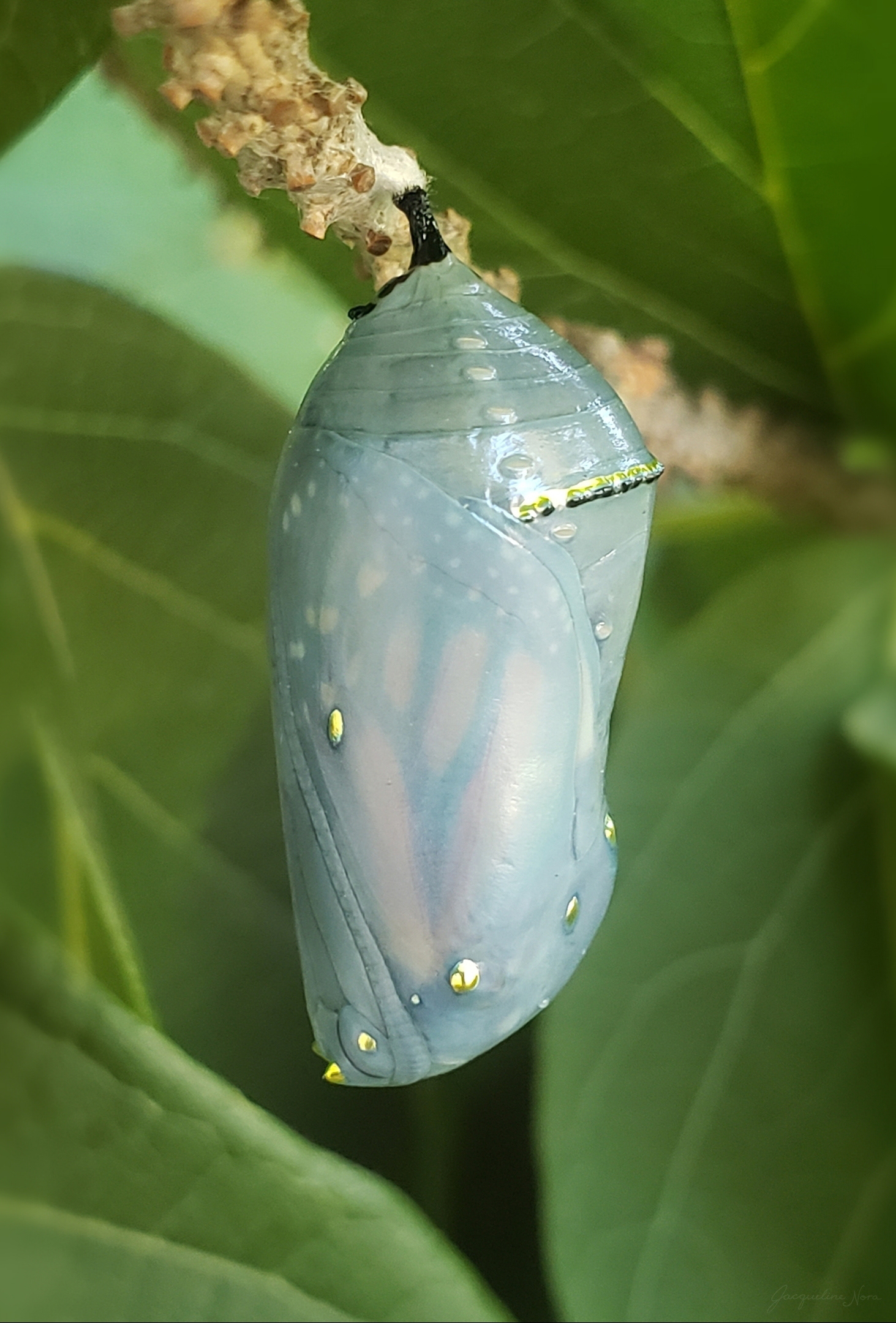After about two weeks, the chrysalis starts to darken and the newly formed butterfly inside starts to becomes slightly visible.
