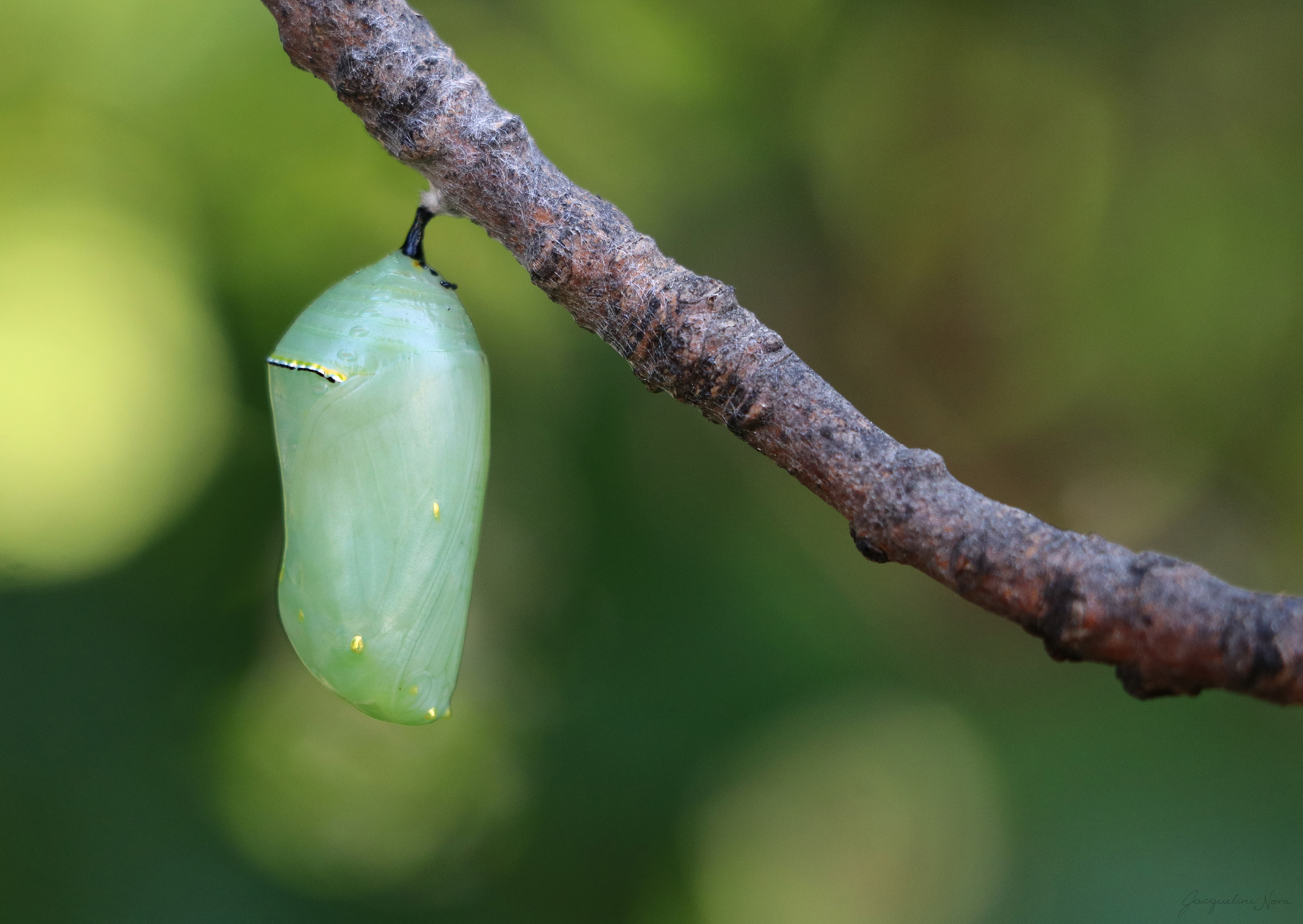 Once the chrysalis has fully darkened it briefly becomes crystal clear, indicating the monarch is ready to eclose.